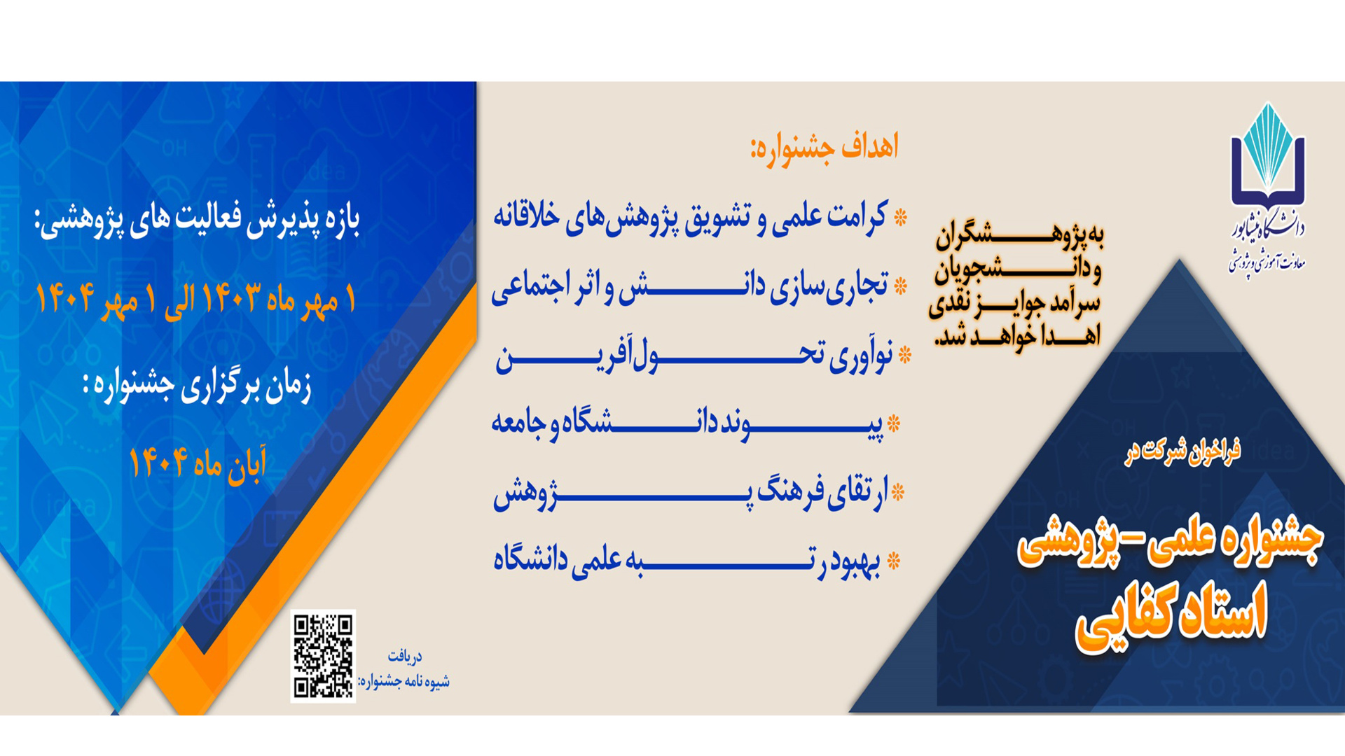 وزه معاونت آموزشی و پژوهشی دانشگاه در نظر دارد «جشنواره علمی پژوهشی استاد کفایی» را با حمایت خیّر فرهیخته جناب استاد کفایی در آبان ماه 1404 برگزار نماید.